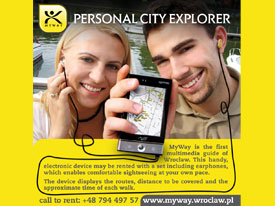 Zwiedzanie miasta nie musi odbywać się według cudzego planu, w tempie narzuconym przez przewodnika lub z niewygodną mapą, która musi być pod ręką, ale nigdy nie ma jej gdzie włożyć. Nowoczesne gadżety pozwalają nam na dużo większą swobodę. Praktyczne rozwiązanie jest właściwie dosłownie w zasięgu ręki. Personal City Explorer to małe urządzonko PDA, które uprzyjemnia i ułatwia zwiedzanie, pozwalając dopasować trasę do ciebie, a nie ciebie do trasy. Przygotowane tu spacery po mieście pozwalają na odkrywanie tajemnic i uroczych, mniej uczęszczanych miejsc we Wrocławiu obok tych najbardziej znanych i obleganych przez turystów.Dzięki GPS, łatowo zorientujesz się w topografii miasta, sprawdzisz długość wybranej trasy oraz przewidywany czas przejścia. Przez słuchawki wysłuchasz ciekwych informacji dotyczących historii miasta i mijanych miejsc. Wystarczy jeden telefon, by wypożyczyć zestaw i cieszyć się wolnością i urokami Wrocławia.